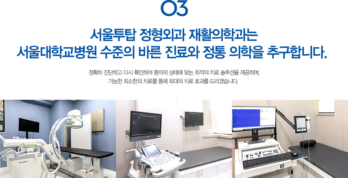 ¼­¿ïÅõž Á¤Çü¿Ü°ú ÀçȰÀÇÇаú´Â ¼­¿ï´ëÇб³º´¿ø ¼öÁØÀÇ ¹Ù¸¥ Áø·á¿Í Á¤Åë ÀÇÇÐÀ» Ãß±¸ÇÕ´Ï´Ù. Á¤È®È÷ Áø´ÜÇÏ°í ´Ù½Ã È®ÀÎÇÏ¿© ȯÀÚÀÇ »óÅ¿¡ ¸Â´Â ÃÖÀûÀÇ Ä¡·á ¼Ö·ç¼ÇÀ» Á¦°øÇϸç, °¡´ÉÇÑ ÃÖ¼ÒÇÑÀÇ Ä¡·á¸¦ ÅëÇØ ÃÖ´ëÀÇ Ä¡·á È¿°ú¸¦ µå¸®°Ú½À´Ï´Ù.