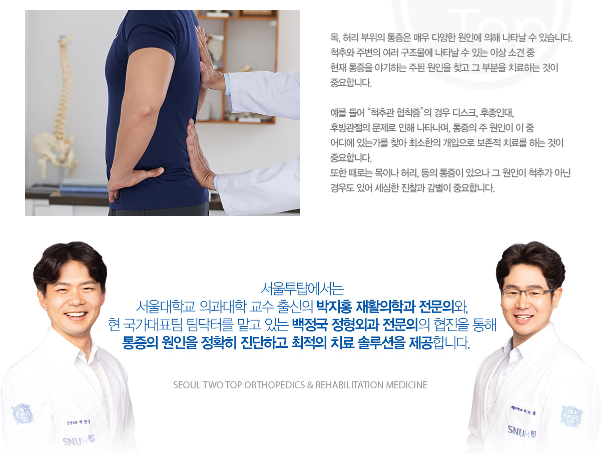 ¸ñ, Ç㸮 ºÎÀ§ÀÇ ÅëÁõÀº ¸Å¿ì ´Ù¾çÇÑ ¿øÀο¡ ÀÇÇØ ³ªÅ¸³¯ ¼ö ÀÖ½À´Ï´Ù. ôÃß¿Í ÁÖº¯ÀÇ ¿©·¯ ±¸Á¶¹°¿¡ ³ªÅ¸³¯ ¼ö ÀÖ´Â ÀÌ»ó ¼Ò°ß Áß ÇöÀç ÅëÁõÀ» ¾ß±âÇÏ´Â ÁÖµÈ ¿øÀÎÀ» ã°í ±× ºÎºÐÀ» Ä¡·áÇÏ´Â °ÍÀÌ Áß¿äÇÕ´Ï´Ù. ¿¹¸¦ µé¾î ¡°Ã´Ãß°ü ÇùÂøÁõ¡±ÀÇ °æ¿ì µð½ºÅ©, ÈÄÁ¾Àδë, ÈĹæ°üÀýÀÇ ¹®Á¦·Î ÀÎÇØ ³ªÅ¸³ª¸ç, ÅëÁõÀÇ ÁÖ ¿øÀÎÀÌ ÀÌ Áß ¾îµð¿¡ Àִ°¡¸¦ ã¾Æ ÃÖ¼ÒÇÑÀÇ °³ÀÔÀ¸·Î º¸Á¸Àû Ä¡·á¸¦ ÇÏ´Â °ÍÀÌ Áß¿äÇÕ´Ï´Ù. ¶ÇÇÑ ¶§·Î´Â ¸ñÀ̳ª Ç㸮, µîÀÇ ÅëÁõÀÌ ÀÖÀ¸³ª ±× ¿øÀÎÀÌ Ã´Ãß°¡ ¾Æ´Ñ °æ¿ìµµ ÀÖ¾î ¼¼½ÉÇÑ ÁøÂû°ú °¨º°ÀÌ Áß¿äÇÕ´Ï´Ù. ¼­¿ïÅõž¿¡¼­´Â ¼­¿ï´ëÇб³ Àǰú´ëÇÐ ±³¼ö Ãâ½ÅÀÇ ¹ÚÁöÈ« ÀçȰÀÇÇаú Àü¹®ÀÇ¿Í, Çö ±¹°¡´ëÇ¥ÆÀ ÆÀ´ÚÅ͸¦ ¸Ã°í ÀÖ´Â ¹éÁ¤±¹ Á¤Çü¿Ü°ú Àü¹®ÀÇÀÇ ÇùÁøÀ» ÅëÇØ ÅëÁõÀÇ ¿øÀÎÀ» Á¤È®È÷ Áø´ÜÇϰí ÃÖÀûÀÇ Ä¡·á ¼Ö·ç¼ÇÀ» Á¦°øÇÕ´Ï´Ù.