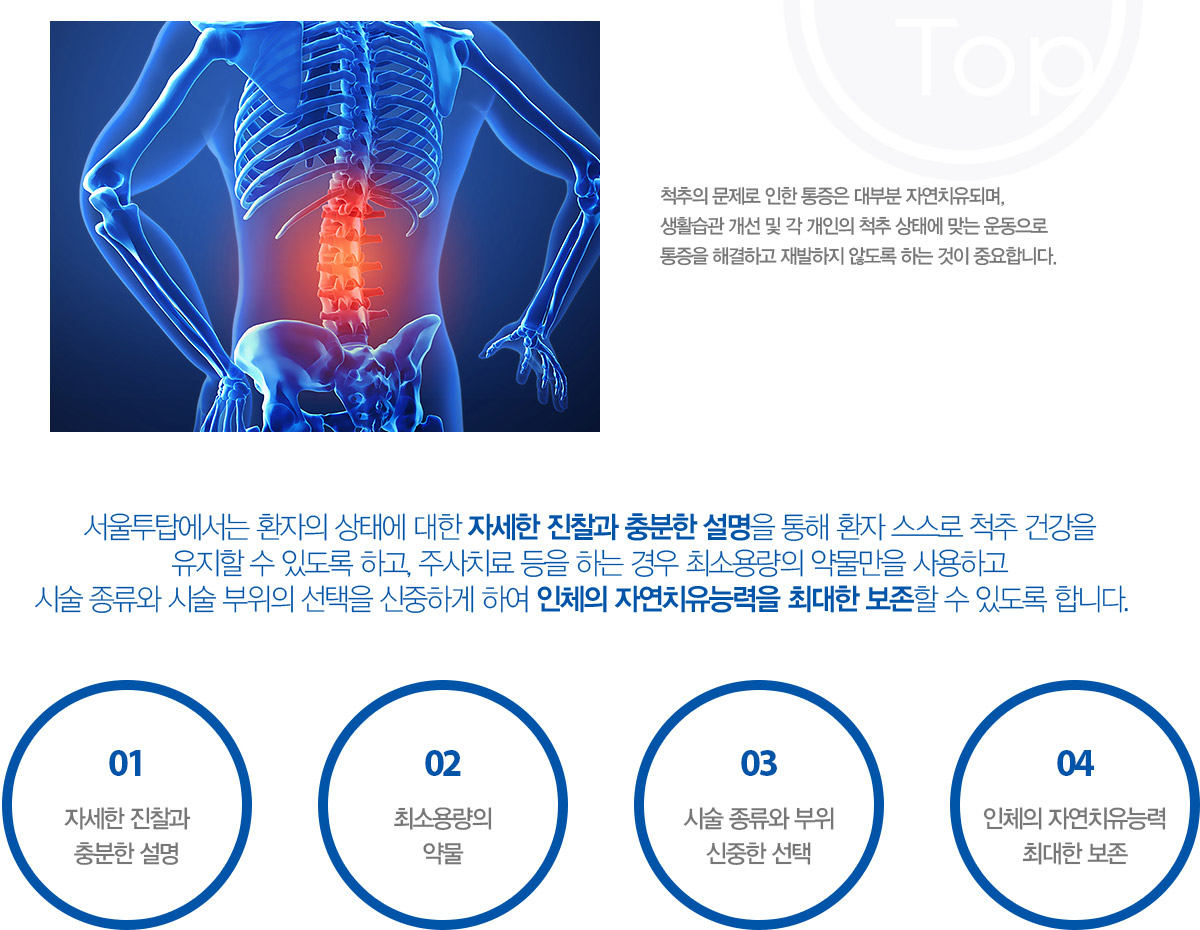 ôÃßÀÇ ¹®Á¦·Î ÀÎÇÑ ÅëÁõÀº ´ëºÎºÐ ÀÚ¿¬Ä¡À¯µÇ¸ç, »ýȰ½À°ü °³¼± ¹× °¢ °³ÀÎÀÇ Ã´Ãß »óÅ¿¡ ¸Â´Â ¿îµ¿À¸·Î ÅëÁõÀ» ÇØ°áÇϰí Àç¹ßÇÏÁö ¾Êµµ·Ï ÇÏ´Â °ÍÀÌ Áß¿äÇÕ´Ï´Ù. ¼­¿ïÅõž¿¡¼­´Â ȯÀÚÀÇ »óÅ¿¡ ´ëÇÑ ÀÚ¼¼ÇÑ ÁøÂû°ú ÃæºÐÇÑ ¼³¸íÀ» ÅëÇØ ȯÀÚ ½º½º·Î ôÃß °Ç°­À» À¯ÁöÇÒ ¼ö ÀÖµµ·Ï Çϰí, ÁÖ»çÄ¡·á µîÀ» ÇÏ´Â °æ¿ì ÃÖ¼Ò¿ë·®ÀÇ ¾à¹°¸¸À» »ç¿ëÇÏ°í ½Ã¼ú Á¾·ù¿Í ½Ã¼ú ºÎÀ§ÀÇ ¼±ÅÃÀ» ½ÅÁßÇÏ°Ô ÇÏ¿© ÀÎüÀÇ ÀÚ¿¬Ä¡À¯´É·ÂÀ» ÃÖ´ëÇÑ º¸Á¸ÇÒ ¼ö ÀÖµµ·Ï ÇÕ´Ï´Ù.