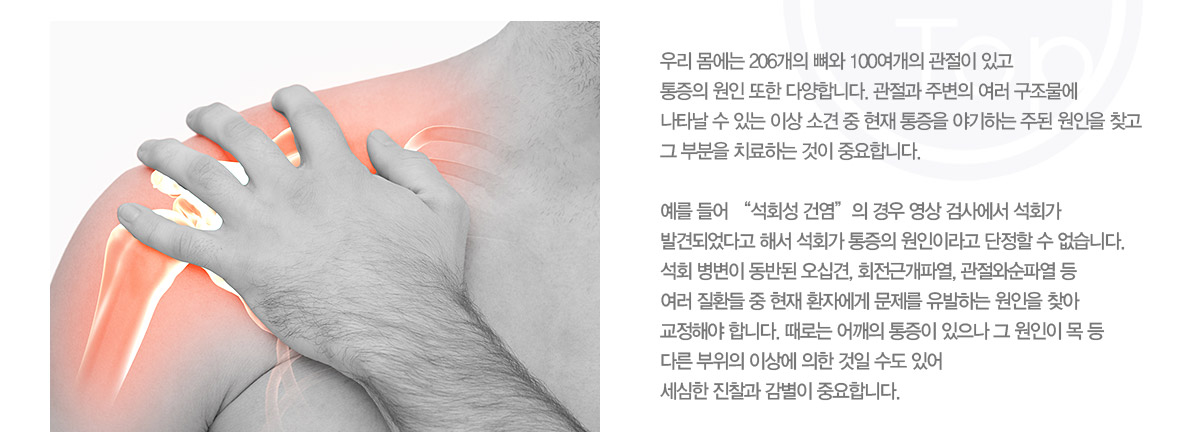 ¿¹¸¦ µé¾î ¡°¼®È¸¼º °Ç¿°¡±ÀÇ °æ¿ì ¿µ»ó °Ë»ç¿¡¼ ¼®È¸°¡ ¹ß°ßµÇ¾ú´Ù°í ÇØ¼ ¼®È¸°¡ ÅëÁõÀÇ ¿øÀÎÀ̶ó°í ´ÜÁ¤ÇÒ ¼ö ¾ø½À´Ï´Ù. ¼®È¸ º´º¯ÀÌ µ¿¹ÝµÈ ¿À½Ê°ß, ȸÀü±Ù°³ÆÄ¿, °üÀý¿Í¼øÆÄ¿ µî ¿©·¯ Áúȯµé Áß ÇöÀç ȯÀÚ¿¡°Ô ¹®Á¦¸¦ À¯¹ßÇÏ´Â ¿øÀÎÀ» ã¾Æ ±³Á¤ÇØ¾ß ÇÕ´Ï´Ù. ¶§·Î´Â ¾î±úÀÇ ÅëÁõÀÌ ÀÖÀ¸³ª ±× ¿øÀÎÀÌ ¸ñ µî ´Ù¸¥ ºÎÀ§ÀÇ ÀÌ»ó¿¡ ÀÇÇÑ °ÍÀÏ ¼öµµ ÀÖ¾î ¼¼½ÉÇÑ ÁøÂû°ú °¨º°ÀÌ Áß¿äÇÕ´Ï´Ù.