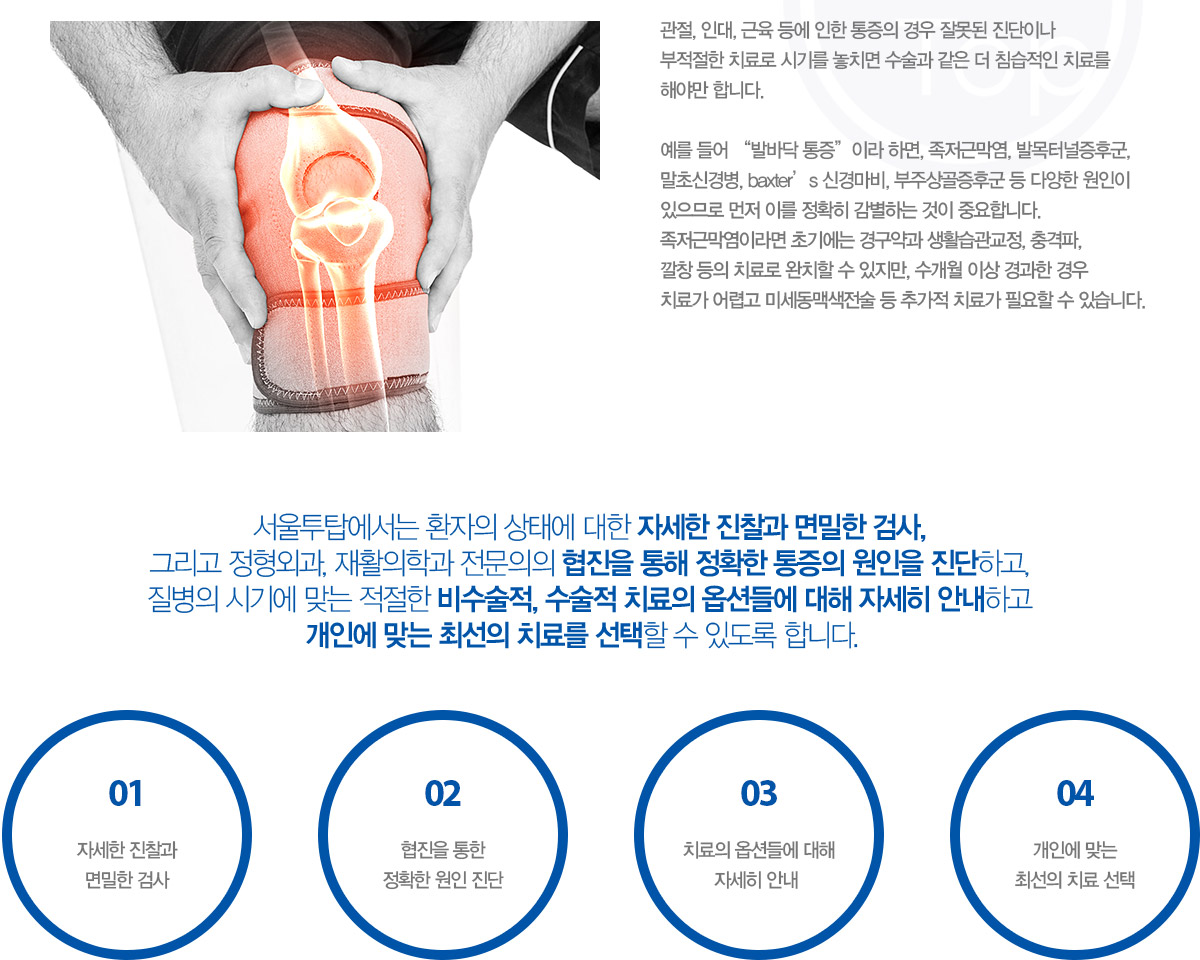 ¼¿ïÅõž¿¡¼´Â ȯÀÚÀÇ »óÅ¿¡ ´ëÇÑ ÀÚ¼¼ÇÑ ÁøÂû°ú ¸é¹ÐÇÑ °Ë»ç, ±×¸®°í Á¤Çü¿Ü°ú, ÀçȰÀÇÇаú Àü¹®ÀÇÀÇ ÇùÁøÀ» ÅëÇØ Á¤È®ÇÑ ÅëÁõÀÇ ¿øÀÎÀ» Áø´ÜÇϰí, Áúº´ÀÇ ½Ã±â¿¡ ¸Â´Â ÀûÀýÇÑ ºñ¼ö¼úÀû, ¼ö¼úÀû Ä¡·áÀÇ ¿É¼Çµé¿¡ ´ëÇØ ÀÚ¼¼È÷ ¾È³»ÇÏ°í °³Àο¡ ¸Â´Â ÃÖ¼±ÀÇ Ä¡·á¸¦ ¼±ÅÃÇÒ ¼ö ÀÖµµ·Ï ÇÕ´Ï´Ù.